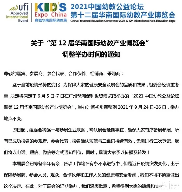 關(guān)于第12屆華南幼教展調(diào)整舉辦時(shí)間的通知