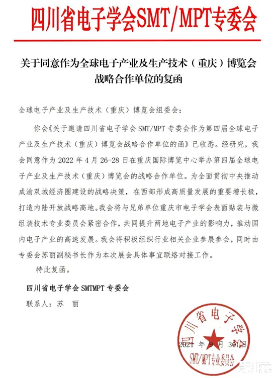 2021年9月,為全面貫徹中央推動(dòng)成渝雙城經(jīng)濟(jì)圈建設(shè)的戰(zhàn)略決策,在西部形成高質(zhì)量發(fā)展的重要增長(zhǎng)極,打造內(nèi)陸開放戰(zhàn)略高地,重慶市電子學(xué)會(huì)MT/MPT專委會(huì)與四川省電子學(xué)會(huì)SMT/MPT專委會(huì)達(dá)成戰(zhàn)略合作,提升兩地電子產(chǎn)業(yè)影響力,推動(dòng)國(guó)內(nèi)電子產(chǎn)業(yè)高速發(fā)展。 (本文內(nèi)容版權(quán)歸屬聚展所有,未經(jīng)同意,禁止轉(zhuǎn)發(fā))