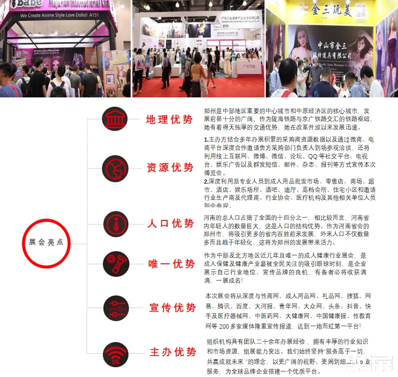 隨著我國人口逐將進(jìn)入老齡化社會,國家不停的優(yōu)化生育政策。早在幾年前放開了二胎政策,如今又在不同的地區(qū)開始慢慢放開三胎政策作為試點(diǎn)來彌補(bǔ)我國老齡化程度加重的問題。為滿足市場需求成人用品及健康產(chǎn)業(yè)得到了快速發(fā)展,依托全國人口大省中原河南地理優(yōu)勢經(jīng)濟(jì)帶和覆蓋京津冀華北國際經(jīng)濟(jì)中心城市的區(qū)位優(yōu)勢,結(jié)合國家利好政策的有利條件,繼歷年成功舉辦中原性文化博覽會的基礎(chǔ)上,主辦方經(jīng)過多年的深思沉淀為更好的服務(wù)于中部及彌補(bǔ)北方地區(qū)成人用品及大健康行業(yè)發(fā)展的空缺,推動行業(yè)向更高質(zhì)量發(fā)展,搭建行業(yè)品牌展示、產(chǎn)品采購、交流與合作的平臺。