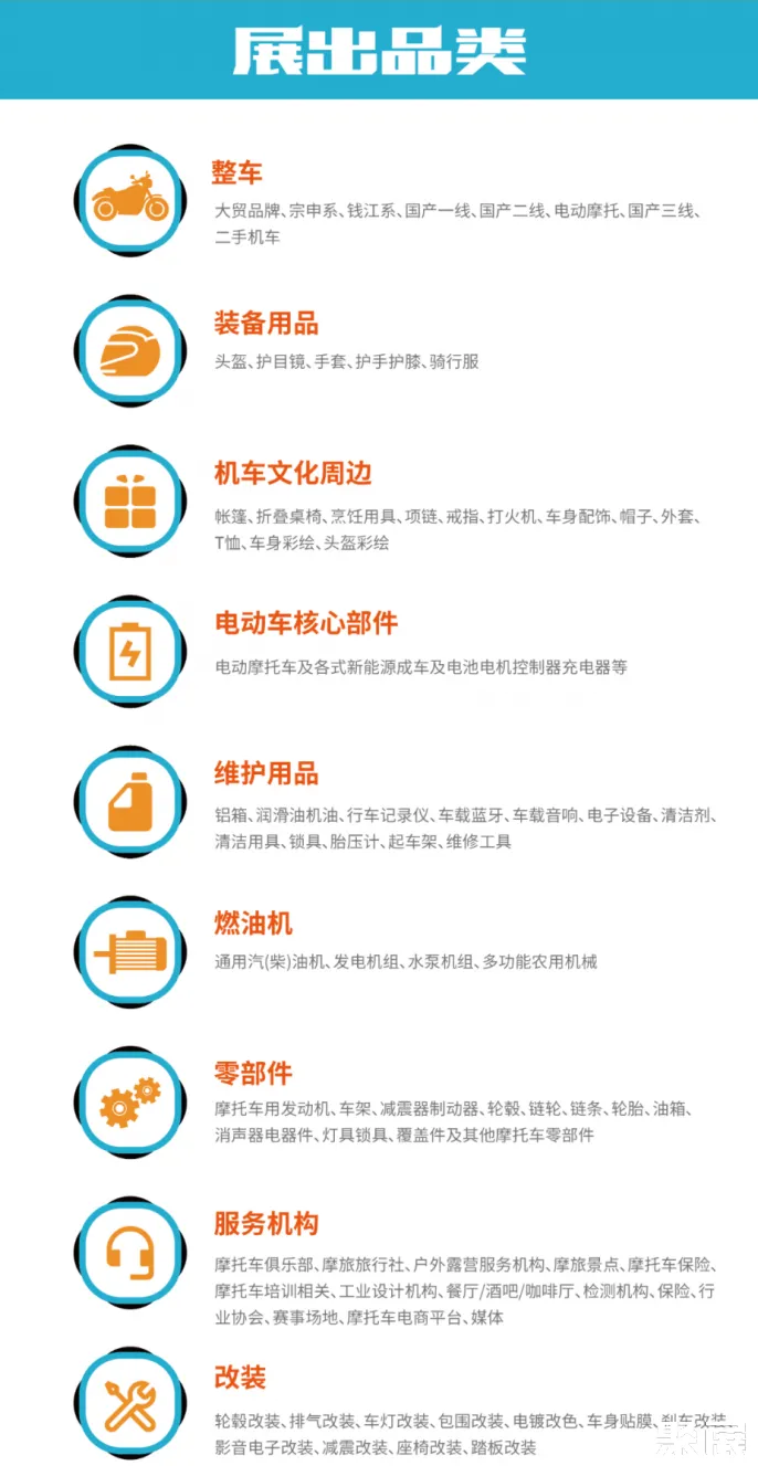 主辦方合理優(yōu)化展商結(jié)構(gòu),以摩友用車流程設(shè)計(jì)展示品類,從購車-配置裝備-定制改裝-接受機(jī)車周邊服務(wù)-享受機(jī)車生活的邏輯程序,構(gòu)置整車展區(qū)、裝備用品展區(qū)、改裝及零部件展區(qū)、周邊服務(wù)展區(qū)、機(jī)車潮流生活展區(qū)五大板塊,覆蓋62個(gè)行業(yè)品類,讓客商能快捷便利地找到自己所需產(chǎn)品、產(chǎn)生交易,并讓參展商及時(shí)回饋到市場(chǎng)的需求信息。