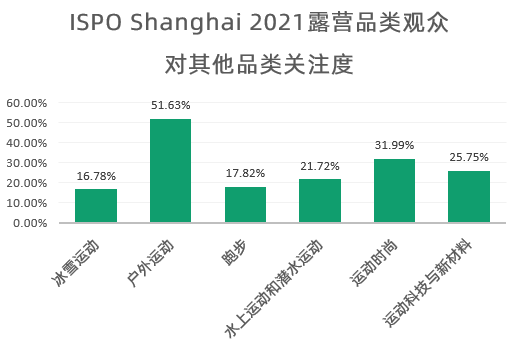 從政策開放到市場的快速響應,露營產業(yè)迎來了黃金發(fā)展期,作為綜合性較高的戶外活動,露營展露出強大的跨界能力。ISPO Shanghai 2021露營品類觀眾中,超過七成買家展現出了對其他板塊內容的關注。