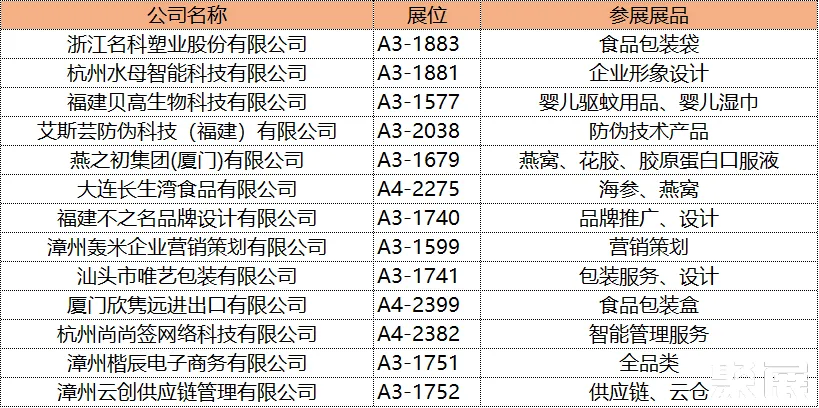 在本屆展會(huì)中,與沃爾瑪合作的展商有濱州健源、中山依之舍、湖北安興等;與山姆、開(kāi)市客合作的展商有燕山板栗、寧夏沃福百瑞等;與盒馬合作的展商有廈門(mén)良一、福建微玉、臺(tái)州瑞康等;給三只松鼠、來(lái)伊份、良品鋪?zhàn)?、百草味做代加工的展商有顏派食品、福建億達(dá)、蠟筆小新(福建)食品等。