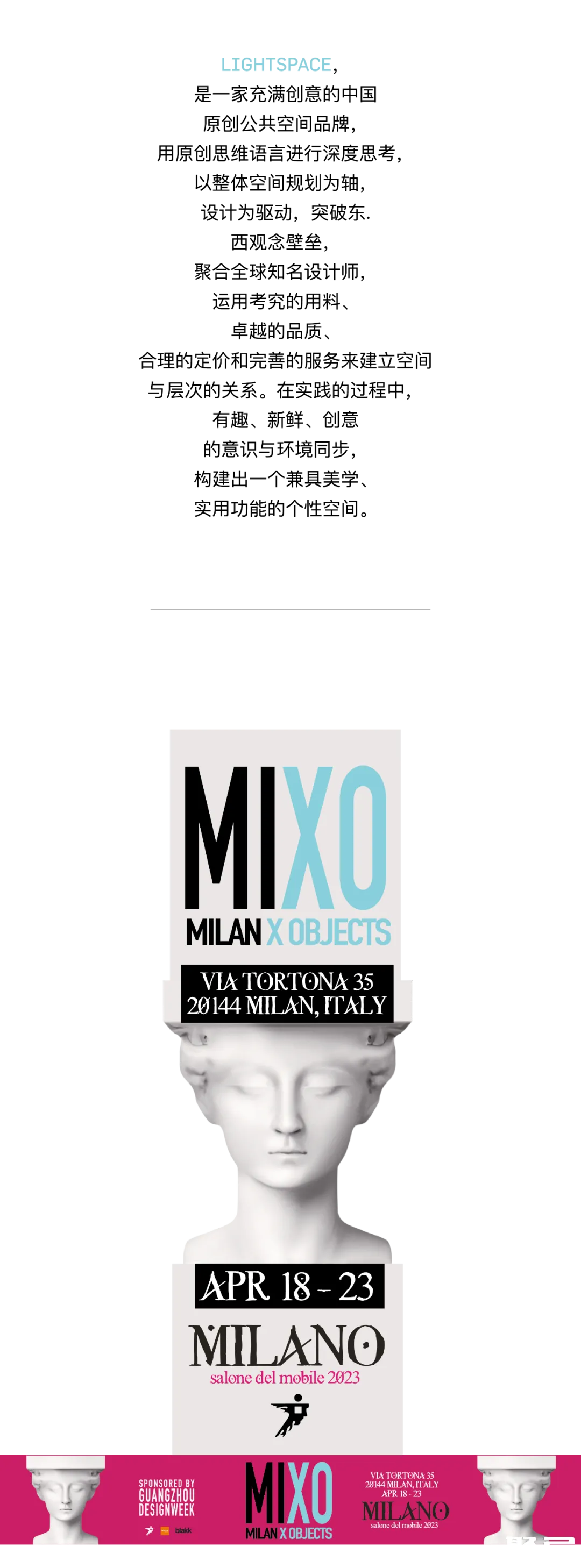 米蘭MIXO設(shè)計(jì)展是「世界的中國(guó)」2023廣州設(shè)計(jì)周歐洲盛典的展覽活動(dòng)項(xiàng)目之一,闊別四年,2023廣州設(shè)計(jì)周將重啟「世界的中國(guó)」全球巡回盛典的推廣計(jì)劃,繼續(xù)踐行讓世界重新認(rèn)知中國(guó)設(shè)計(jì)和品牌的行動(dòng)。