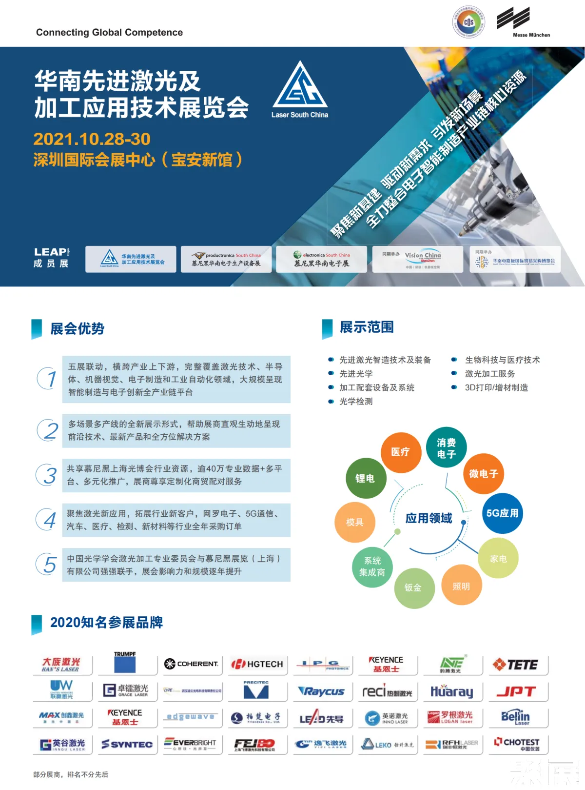 深圳華南先進(jìn)激光及加工應(yīng)用技術(shù)展(Laser South China)作為L(zhǎng)EAP成員展,華南激光展將與慕尼黑華南電子展、慕尼黑華南電子設(shè)備展、深圳國(guó)際自動(dòng)化及機(jī)器人技術(shù)展覽會(huì)、中國(guó)(深圳)機(jī)器視覺(jué)展覽會(huì)暨機(jī)器視覺(jué)技術(shù)及工業(yè)應(yīng)用研討會(huì)同期舉辦,五展聯(lián)動(dòng),貫穿并融合智能制造產(chǎn)業(yè)鏈。